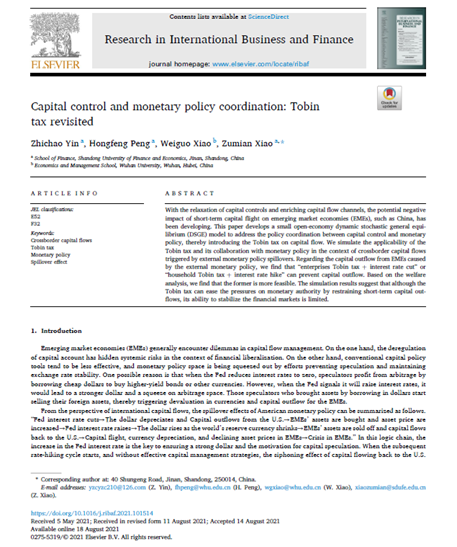 新澳彩 教师尹智超作为第一作者与彭红枫教授、武汉大学肖卫国教授、肖祖沔副教授合作撰写的论文“Capital Control and Monetary Policy Coordination: Tobin Tax Revisited”在期刊《Research in International Business and Finance》发表(2021年8月)。该期刊系SSCI一区期刊,2020年影响因子为4.09,属我校A1类期刊。