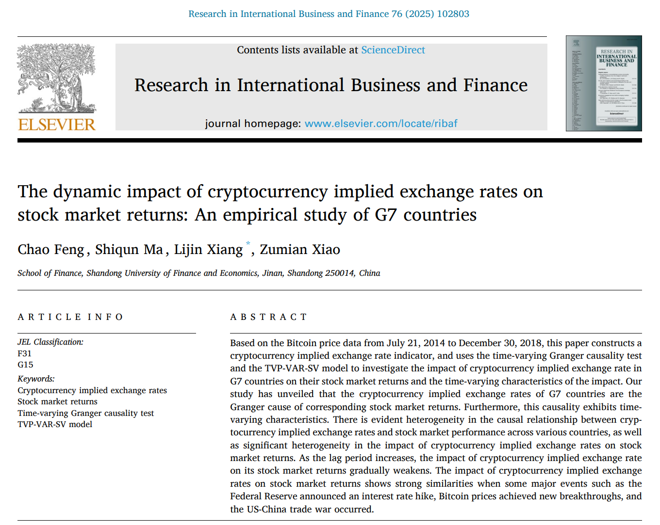 新澳彩 副教授向丽锦作为通讯作者与博士生封超、马世群及副教授肖祖沔合作的论文《The dynamic impact of cryptocurrency implied exchange rates on stock market returns: An empirical study of G7 countries》在期刊《Research in International Business and Finance》在线发表(2025年2月)。该期刊为SSCI一区期刊,期刊最新影响因子为6.3,属我校A1类期刊。