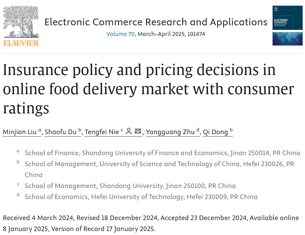 新澳彩 讲师刘敏建以第一作者与中国科学技术大学管理新澳彩杜少甫教授、山东大学管理新澳彩聂腾飞教授、合肥工业大学经济新澳彩讲师朱扬光以及中国科学技术大学管理新澳彩博士生董齐合作撰写的论文《Insurance policy and pricing decisions in online food delivery market with consumer ratings》在《Electronic Commerce Research and Applications》2025年第70卷(Volume 70, March–April 2025, 101474)发表。该期刊为SSCI一区期刊,期刊最新影响因子为5.9,属我校A2类期刊。