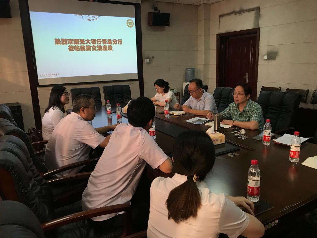 (通讯员:王亚男)9月9日下午,中国光大银行青岛分行总部一行四人来访,在金融楼第一会议室召开了校企合作座谈会。中国光大银行青岛分行人力资源部陈立刚副总经理、中国光大银行青岛研发中心臧培科处长,我校就业指导处副处长周广春、新澳彩党委副书记范志毅、院学工办主任孙琦等参加了座谈会。