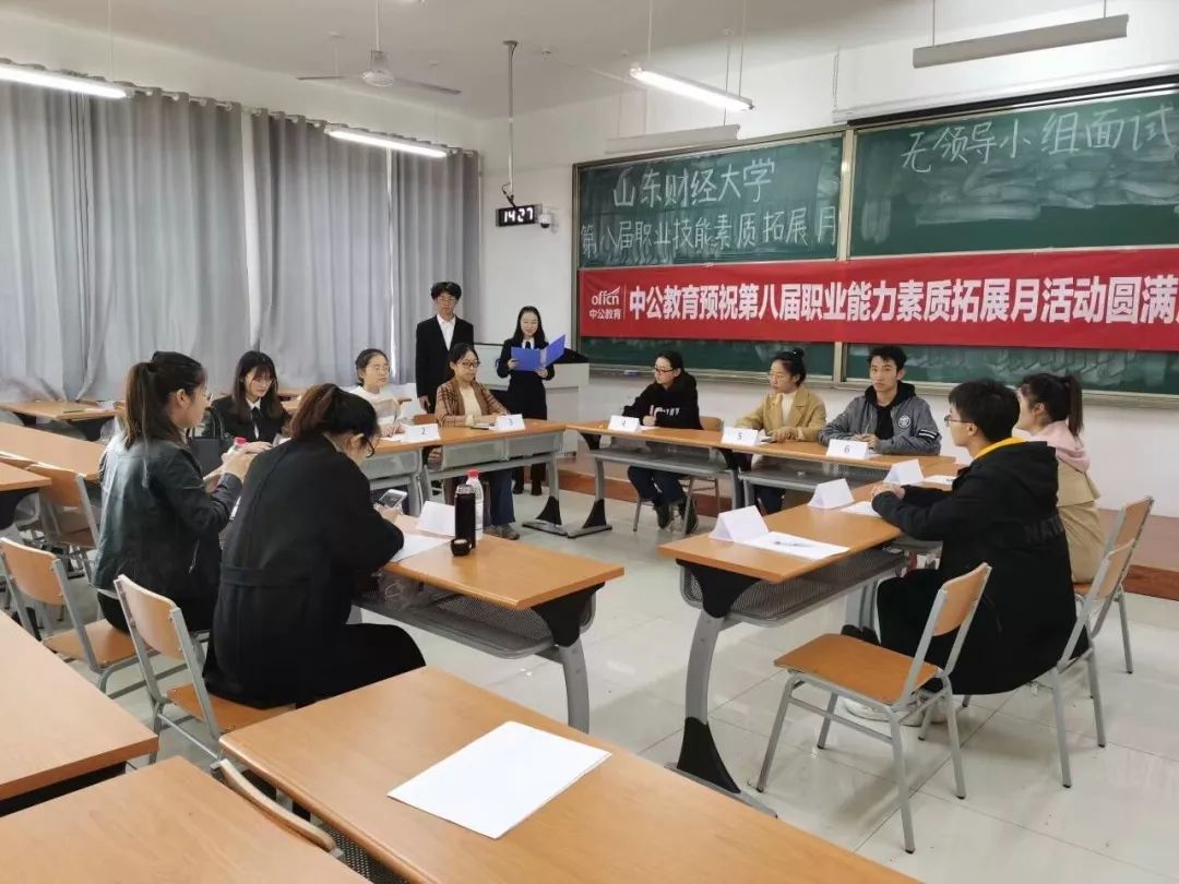 11月7日,由新澳彩 就业指导处主办,新澳彩 承办的第八届职业能力素质拓展活动月系列活动之一的无领导小组面试大赛先后圣井校区、舜耕校区举办。新澳彩 2016级辅导员王亚男,中公教育资深研究与面试辅导专家岳腾飞、王娇、张丽老师出席并担任评委。