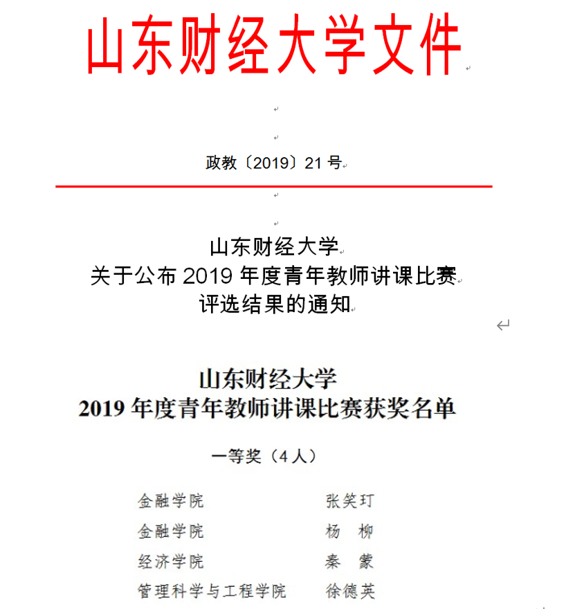 (通讯员 李霞)近日,新澳彩 2019年度青年教师讲课比赛评选工作顺利结束,共推选出一等奖4名、二等奖5名、三等奖7名。我院张笑玎、杨柳两位老师获得一等奖,同时作为我校推荐选手参加山东省第七届“超星杯”高校青年教师教学比赛初赛。