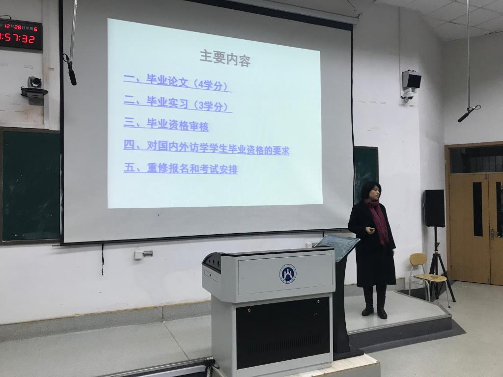 冯玉梅主要从毕业论文、毕业实习、毕业资格审核、国内外访学学生的毕业资格、重修报名和考试安排等几个方面向同学们做了详细耐心的讲解和说明,并对毕业生们在学业方面提出了相关要求。她告诫同学们一定要认真对待毕业前的学业安排,希望大家都可以按时完成本科的各项学习任务,顺利拿到学位证和毕业证。最后她告诉同学们,人生并无所谓成与败,真正的成熟是接纳自己的平凡,享受人生的过程。