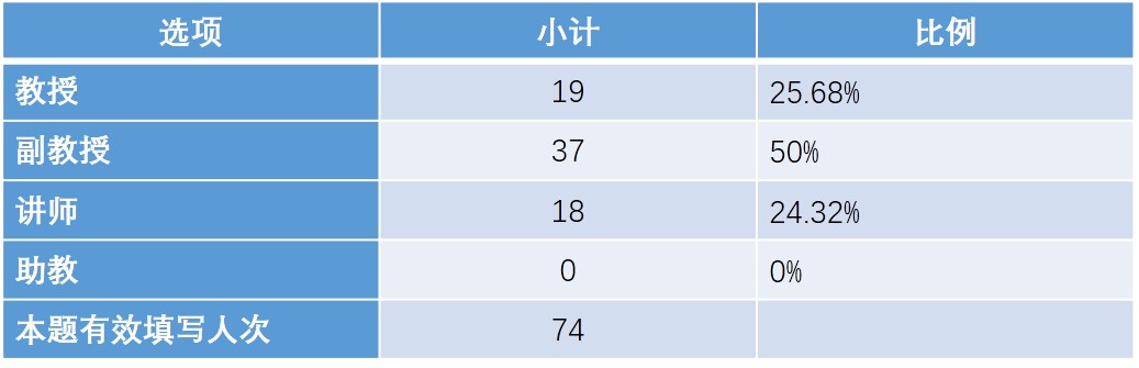 2020年初的新冠肺炎疫情爆发以来,新澳彩 根据学校党委教师工作部和教务处的安排,积极组织老师准备线上教学的各种工作。经过近两周的准备,新澳彩在学校的统一安排下,于2020年2月17日正式开展线上教学工作。为了解教师线上教学活动开展情况,及时发现存在的问题并加以改进,新澳彩于2020年3月2日进行了摸底调查。调查对象覆盖了所有74名开课教师的74个教学班,占全部教学班的39.36%,其中专业必修课45门(占比60.81%),专业选修课29门(占比39.19%),实验课12门(占比16.22%),大二(2018级)和大三(2017级)的教学班占比95.95%(图1)。74名任课教师中,副教授37人,占全部教师人数的50%,教授和讲师各占开课教师数的25%左右(表1)。