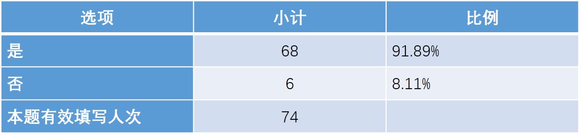 此次在线教学活动在一定程度可以说是前期在线开放课程和混合式教学改革成效的检验,也为后续教学改革的开展和混合式教学模式的推广奠定了基础。在此次在线教学活动之前,有57位老师(占比77.03%)已经使用了在线教学平台/工具开展辅助线下面授教学活动,在教学活动中,98.65%的老师认为自己对线上教学的软硬件环境有较高的熟悉程度(图12)。尤其是经过开课前的培训和准备工作以后,教师线上授课的困难程度已不算太高,83.78%的老师给线上教学前的组织和培训工作给出4分以上的评分(图13),87.85%的老师表示自己开展线上教学活动的困难程度在3分以下,仅有1位老师给出了5分的困难度(图14)。这表明在全面的组织发动和教师积极的努力下,绝大多数老师都能够掌握线上教学工具和方法。这也为未来教学改革尤其是混合教学模式的推广奠定了基础,68位老师(占比91.89%)表示会将线上教学活动的工具和经验移植到正式开学后的教学活动中(表2),57位老师(占比77.02%)对在线教学方式或工具的推荐度给出了4分以上评分(表3)。