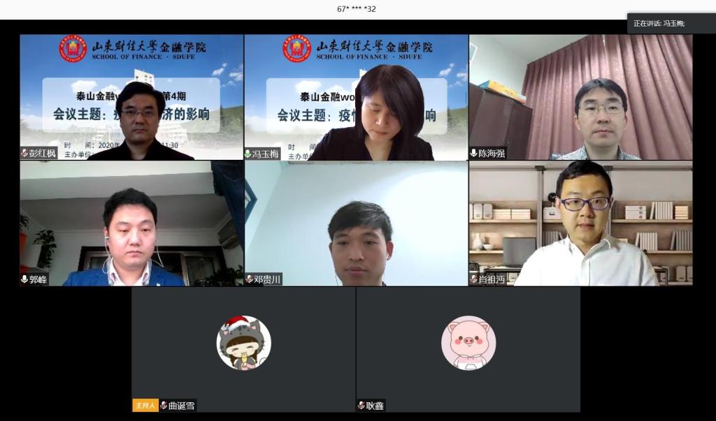 (通讯员:曲诞雪)4月24日上午,由新澳彩 主办,山东省金融学会秘书处、山东省金融产业优化与区域管理协同创新中心承办的“泰山金融workshop(第4期)”通过腾讯会议客户端成功举行。本期会议邀请厦门大学王亚南经济研究院和经济新澳彩金融系教授、博士生导师陈海强,上海财经大学公共经济与管理新澳彩投资系副教授、北京大学数字金融研究中心特约高级研究员郭峰,中山大学国际新澳彩 科研博士后邓贵川和新澳彩 副教授肖祖沔共同就“疫情对经济的影响”这一话题展开研讨。本期会议由新澳彩 副院长冯玉梅主持,院长彭红枫致辞,新澳彩部分教师和学生通过腾讯会议平台观看了会议直播。