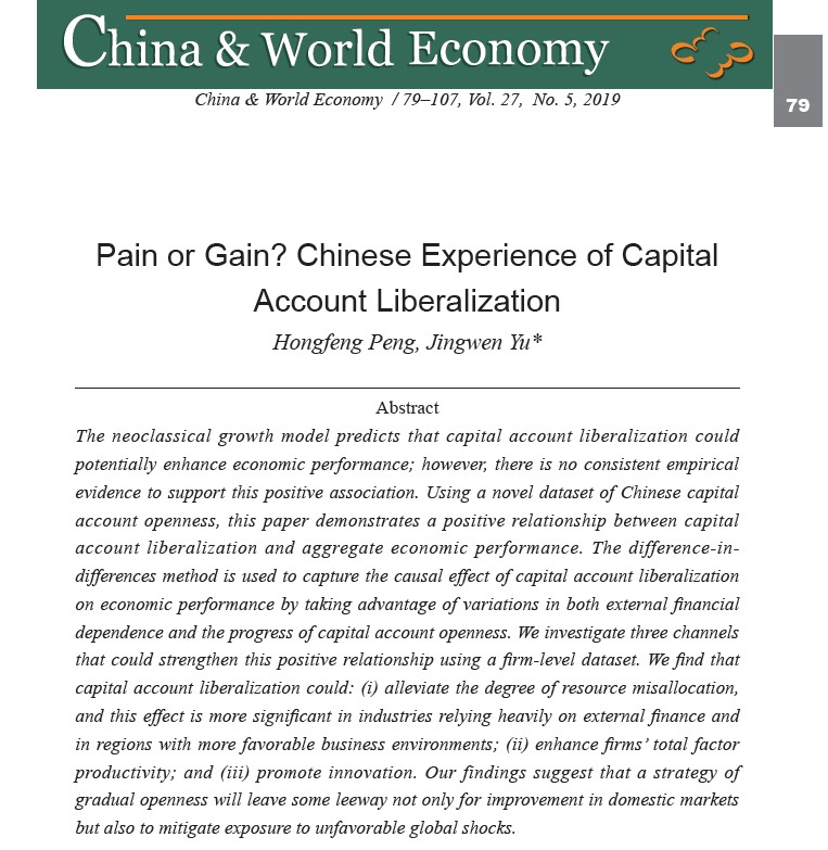 新澳彩 彭红枫教授与武汉大学经济与管理新澳彩金融系余静文副教授合作撰写的论文《Pain or Gain? Chinese Experience of Capital Account Liberalization》在SSCI期刊China & World Economy 第27卷(No. 5,2019)上发表。