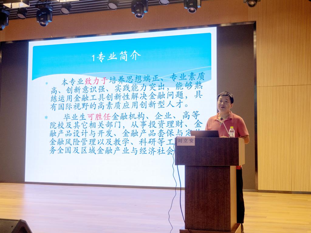 刘立安老师首先从专业培养要求和就业方向为各位新生介绍了金融工程专业。他强调熟练运用金融工具创新性解决金融问题是金融工程的一大特点,要求同学们培养国际视野,成为高素质应用创新人才。随后,刘老师向同学们介绍了金融工程的学科评级、办学历史和历届毕业生的就业情况,以及专业培养方案的核心课程和教学实验室,并向大家推荐了相关书籍来帮助同学们更深入地了解这门专业。