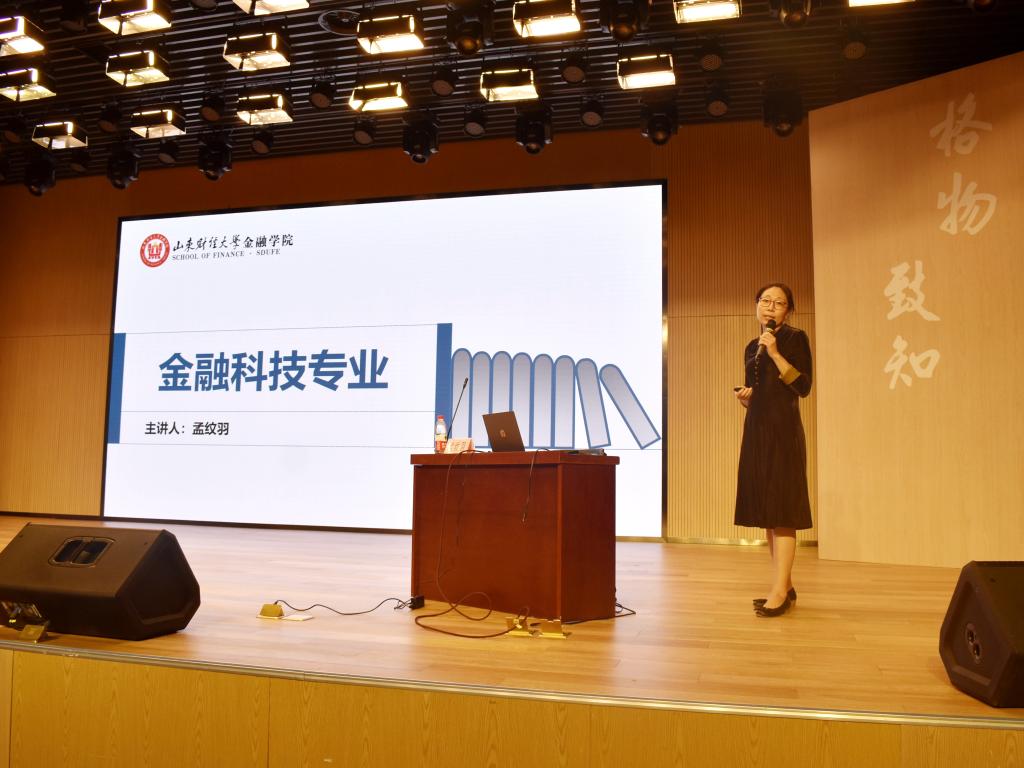 孟纹羽老师从金融行业存在痛点切入,为大家讲述了金融科技专业的必要性,以及金融科技专业的在社会上的作用。并提出了几种解决行业问题的方案。随后,孟老师介绍了金融科技专业的就业方向、培养方案,以及我校金融科技实践平台、专业学习特色-以赛带学等,并以“山东省大学生科技节”、“知链区块链应用创新大赛”为例进行说明。最后她希望同学能掌握好大数据、人工智能和区块链技术等先进技术,积极投身金融科技领域。
