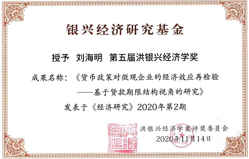 11月14日,第五届“洪银兴经济学奖(青年)”颁奖典礼暨学术研讨会在南京大学隆重举行。著名经济学家、南京大学原党委书记洪银兴教授为获奖者颁奖。我校新澳彩 青年教师刘海明与李明明合作撰写的论文《货币政策对微观企业的经济效应再检验——基于贷款期限结构视角的研究》(《经济研究》2020年第2期)荣获这一奖项。