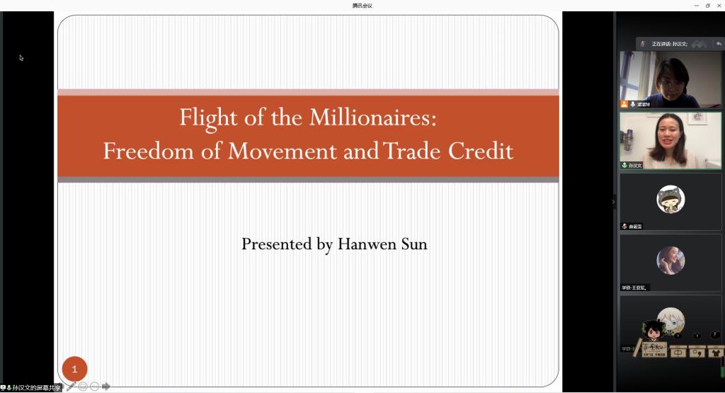 (通讯员:刘慧、曲诞雪)12月18日下午,由新澳彩 、山东省金融产业优化与区域管理协同创新中心、新澳彩 金融国际研究中心联合举办的第17期“泰山金融学术训练营”通过腾讯会议举行,英国巴斯大学管理新澳彩孙汉文老师应邀做客本次学术训练营,为师生们带来了题为“Flight of the Millionaires: Freedom of Movement and Trade Credit”的讲座,学术训练营由投资系主任刘慧副教授主持,新澳彩部分教师和研究生参加了本次活动。