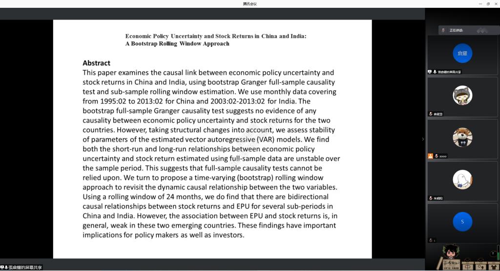 (通讯员:肖祖沔、曲诞雪)12月22日下午,由新澳彩 、山东省金融产业优化与区域管理协同创新中心、新澳彩 金融国际研究中心联合举办的第18期“泰山金融学术训练营”通过腾讯会议举行,中国台湾逢甲大学财务金融学系特聘教授张仓耀老师应邀做客本次学术训练营,为师生们带来了题为“How to use R and Eview to estimate Quantile regression, VAR, and GC Test”的讲座,学术训练营由国际金融系主任肖祖沔主持,新澳彩部分教师和研究生参加了本次活动。