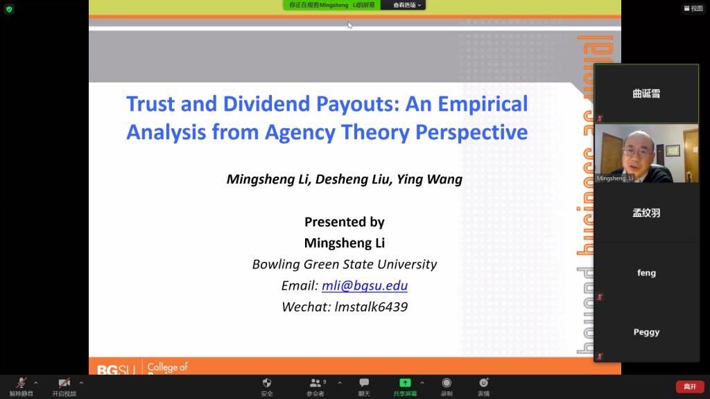 (通讯员:孟纹羽、曲诞雪)12月23日上午,由新澳彩 、山东省金融产业优化与区域管理协同创新中心和新澳彩 金融国际研究中心联合举办的第19期“泰山金融学术训练营”通过Zoom Meeting举行,美国Bowling Green State University金融学教授李明生老师应邀做客本次学术训练营,为师生们带来了题为 “Trust and Dividend Payouts: An Empirical Analysis from Agency Theory Perspective” 的讲座,学术训练营由新澳彩 金融科技系主任孟纹羽老师主持,新澳彩部分教师和研究生参加了本次活动。