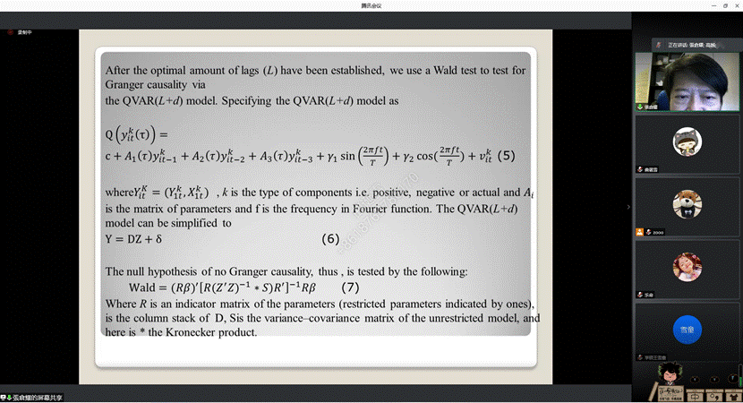 (通讯员:肖祖沔、曲诞雪)12月29日下午,由新澳彩 、山东省金融产业优化与区域管理协同创新中心、新澳彩 金融国际研究中心联合举办的第20期“泰山金融学术训练营”通过腾讯会议举行,中国台湾逢甲大学财务金融学系特聘教授张仓耀老师应邀做客本次学术训练营,为师生们带来了题为“Quantile-on-Quantile Regression”的讲座,学术训练营由国际金融系主任肖祖沔主持,新澳彩部分教师和研究生参加了本次活动。