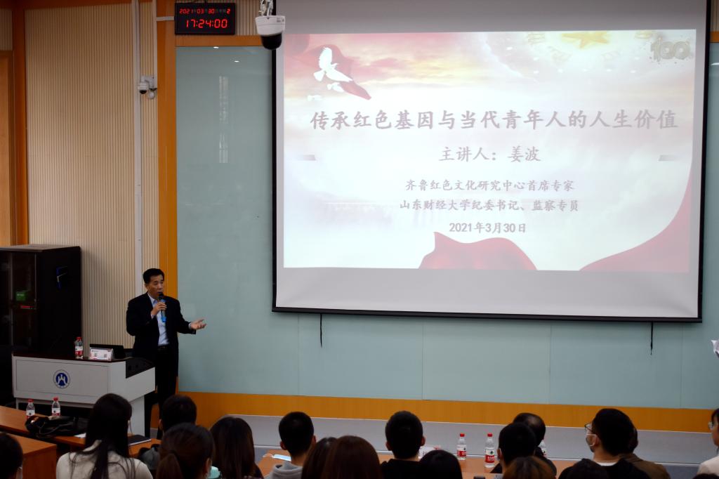 (通讯员 邵珠建 盖哲)3月30日下午,学校纪委书记、省监委驻校监察专员、齐鲁红色文化研究中心首席专家姜波以“传承红色基因与当代青年人的人生价值”为主题,为新澳彩 师生上了一堂生动的党史学习教育课。新澳彩 党委书记吴红文主持报告会,近200名师生现场聆听了报告。