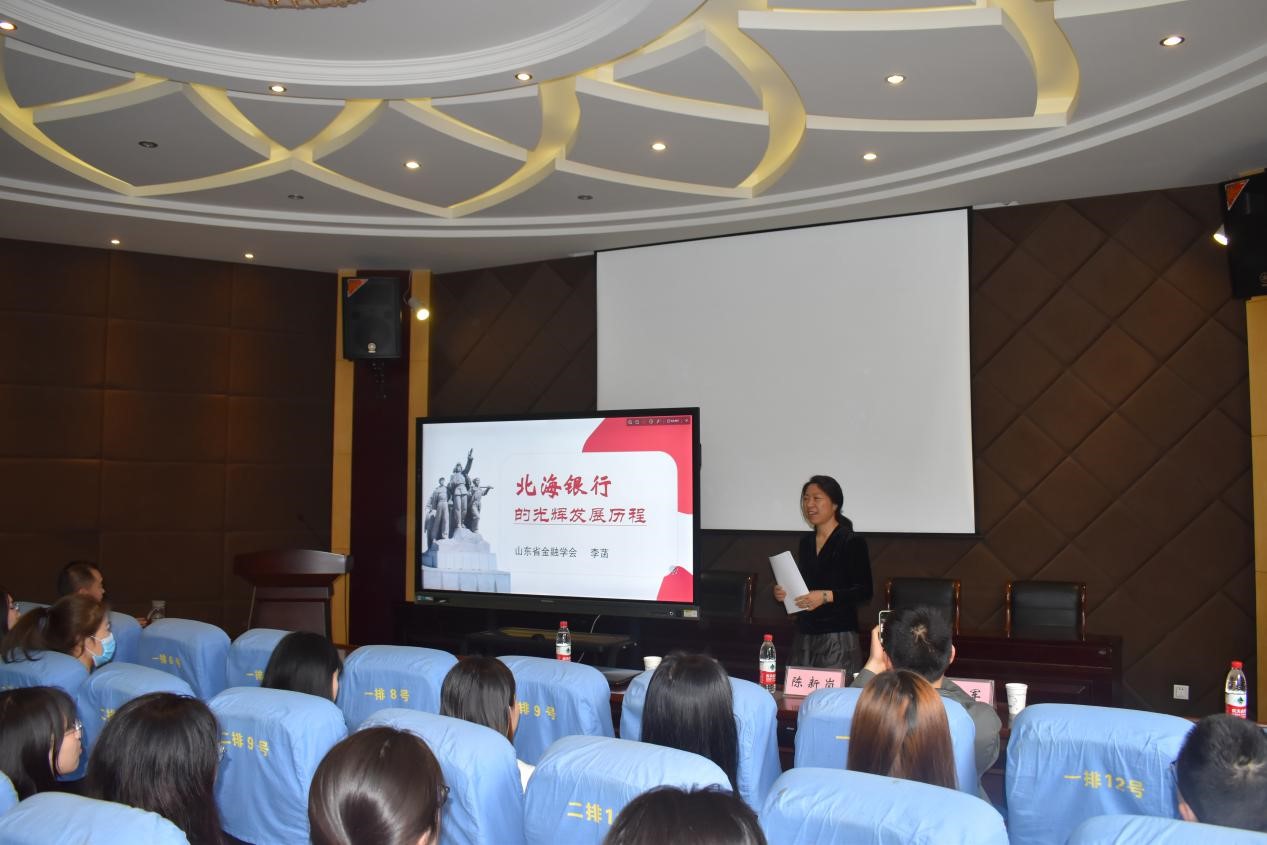 讲座伊始,李菡副处长以“北海银行的光辉发展历程”为主题,向同学们讲述了北海银行的光荣历史。作为山东省红色金融历史的研究专家,李菡副处长首先为大家阐述了北海银行发展历程,指出北海银行的发展史就是我党红色金融的发展史。随后,她向我们详细讲述了北海银行在解放战争期间发挥的积极作用,而这正是北海银行能中国最成功的红色金融机构的首要原因。她把大家带回了那个战火纷飞的年代,一段段红色金融故事重现在了同学们的面前。
