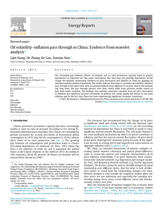 新澳彩 向丽锦副教授作为第一作者撰写的论文“Oil volatility-inflation pass through in China: Evidence from wavelet analysis”在期刊《Energy Reports》发表(2021年第7卷)。该期刊系能源领域SCI一区期刊,2020年影响因子为6.87,属我校A1类期刊。