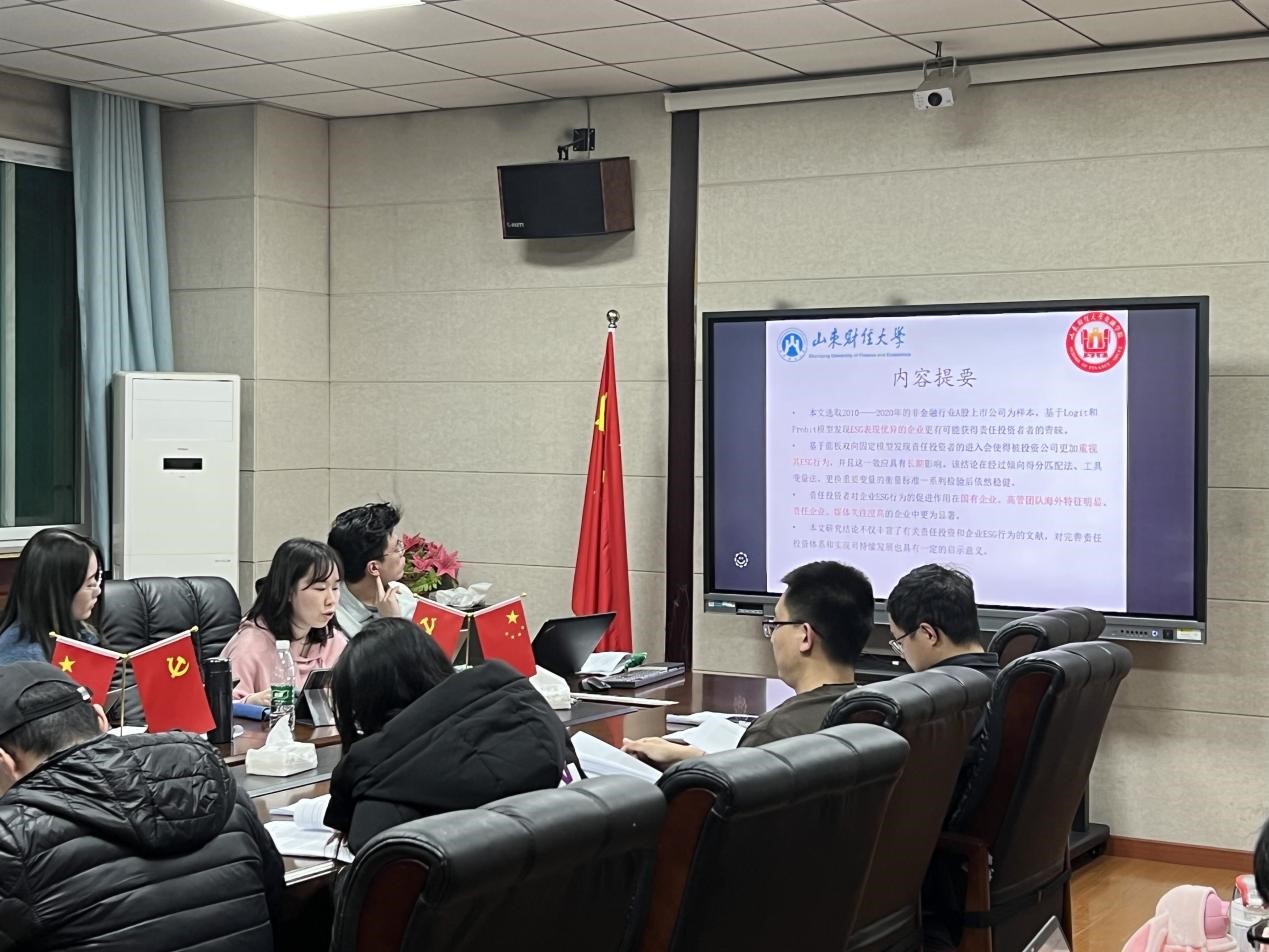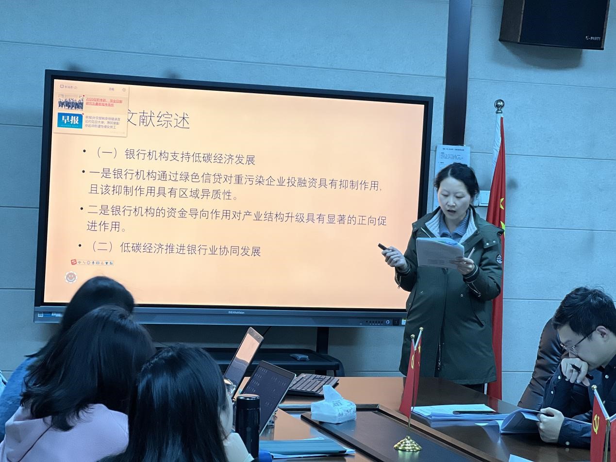 最后,张笑玎博士汇报的论文题目为《低碳城市的创建能够吸引银行分支机构吗?》,文章以不同批次低碳城市设立时间上的差异构成一个“准自然实验”,用双重差分的方法来研究低碳城市的设立与当地银行分支机构数量之间的关系。研究结果表明:低碳城市的设立显著促进了当地银行分支机构数量的增加,经过一系列稳健性检验之后,这一结论依然成立。这一发现将为未来中国低碳城市的设立与发展,以及绿色金融的发展提供理论和经验支持。点评老师围绕模型设定合理性、理论逻辑、变量定义与计算、参考文献选择等提出问题与建议。