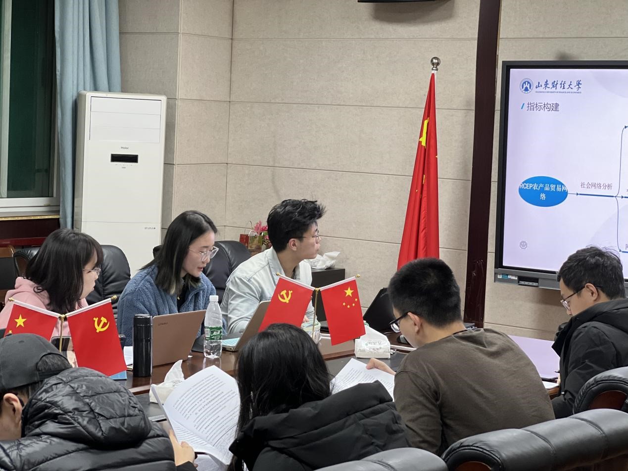 王雪童硕士汇报的论文题目是《RCEP成员国农产品贸易网络的动态结构及其影响因素分析》,文章在当前世界粮食安全日益严峻的背景下,对RCEP成员国农产品贸易关系进行可视化分析,通过网络指标量化、基本贸易单元分析、贸易区中区识别考察了RCEP农产品贸易网络的动态结构演变特征,最后通过二次指派模型研究了产生上述农贸网络时变特征的影响因素。点评老师围绕研究方法、题目选择、样本数据与创新点等提出问题与建议。