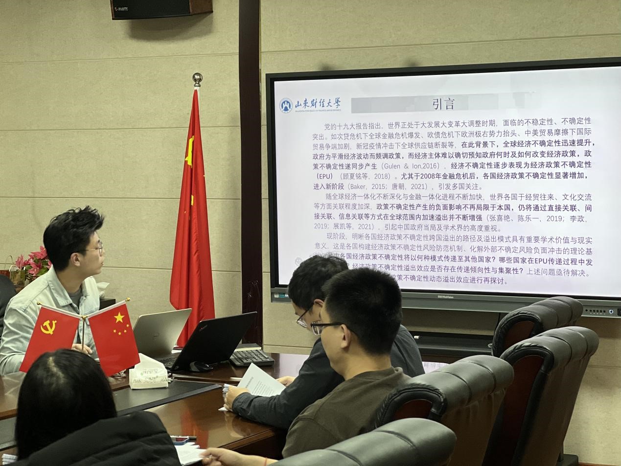马世群硕士汇报的论文题目为《经济政策不确定性动态溢出网络结构特征研究》,文章构建了全球十九个主要国家(地区)经济政策不确定性的时变溢出指数与关联网络整体、结构特征指标,对全球溢出效应的整体网络特征与内部微观结构特征进行动态探究,进而利用QAP分析对网络惯性及网络影响因素进行分析。点评老师围绕数据选择、理论逻辑、创新性等提出问题与建议。