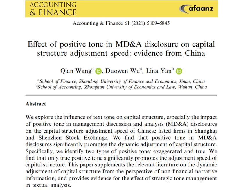 新澳彩 王倩副教授作为第一作者与新澳彩 博士研究生吴多文、中南财经政法大学严丽娜副教授合作的论文“Effect of positive tone in MD&A disclosure on capital structure adjustment speed: evidence from China”在期刊《Accounting and Finance》发表(2021年4月3日第61卷第4期)。该期刊系金融与会计类SSCI二区期刊,2020年影响因子为2.942,属我校A1类期刊。