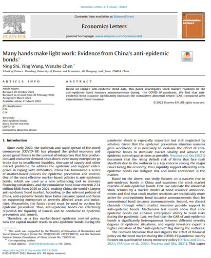 新澳彩 石宁讲师(第一作者)与王营副教授和陈文哲副教授(通讯作者)合作撰写的论文《Many hands make light work:Evidence from China’s anti-epidemic bonds》在《Economics Letters》2022年第214卷发表。该期刊属于我校A1期刊。