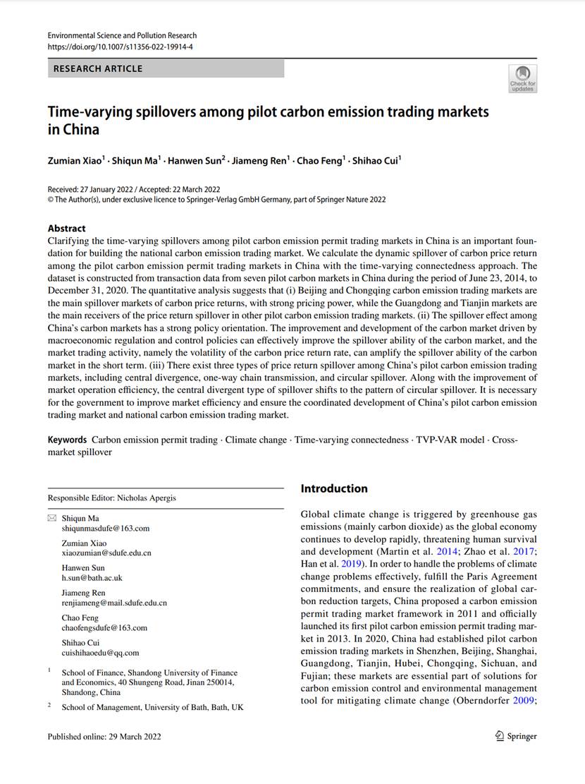 新澳彩 肖祖沔副教授作为第一作者在期刊《Environmental Science and Pollution Research》发表论文“Time‑varying spillovers among pilot carbon emission trading markets in China”(2022年第3期)。该期刊系JCR二区SCI期刊,影响因子为4.223,属我校A2类期刊。合作者包括英国巴斯大学助理教授孙汉文;新澳彩 硕士研究生马世群、封超及本科生任佳萌、崔世豪。