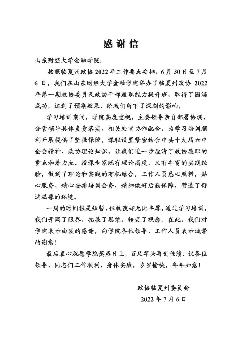 承接培训任务后,新澳彩 EDP中心与州政协办公室和委员工作委员会严格按照州政协党组安排部署,认真研究谋划,反复推敲培训方案,量身定制培训内容,精心准备“精神食粮”和实践教学,在培训地点、教学内容、培训形式等方面进行了精心谋划和细致筹备,在州政协和新澳彩的共同努力下圆满完成各项培训任务,顺利结业返程。培训班结束后,州政协对新澳彩 提供的培训和服务表示满意,特发来感谢信表达培训后的收获和对工作人员诚挚的谢意。