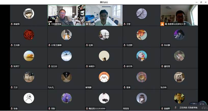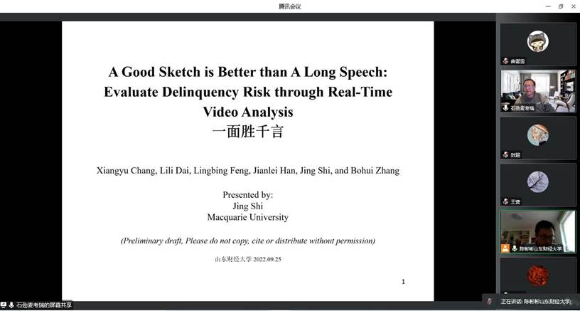 (通讯:陈彬彬)9月29日,由新澳彩 、新澳彩 金融国际研究中心和山东省金融产业优化与区域管理协同创新中心共同主办的第27期“泰山金融论坛”在云端举行。澳大利亚麦考瑞大学商新澳彩教授、新澳彩 特聘教授石劲老师应邀做客本次论坛并分享最新研究成果。本次论坛题目为“A Good Sketch is Better than A Long Speech: Evaluate Delinquency Risk through Real-Time Video Analysis”,由金融科技系副主任陈彬彬主持。新澳彩 院长彭红枫、副院长王营、部分教师及研究生参加了此次论坛。