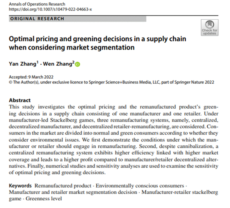 新澳彩 教师张艳作为第一作者发表的论文,“Optimal pricing and greening decisions in a supply chain when considering market segmentation”,在期刊 Annals of Operations Research 在线发表(2022年3月)。该期刊系运筹学与管理科学SCI三区期刊,最新影响因子为6.1,属我校A2类期刊。