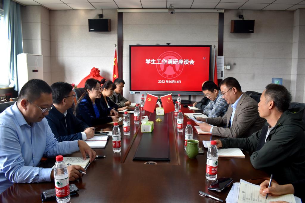 10月14日下午,学校党委学生工作部、学生工作处一行到新澳彩 调研指导工作。副处长孙丽华、张贞梅、周广春、刘思锋、张亚萌到我院调研指导学生管理。新澳彩 党委书记吴红文,副书记康亚通、李开传及全体辅导员参加了座谈会。