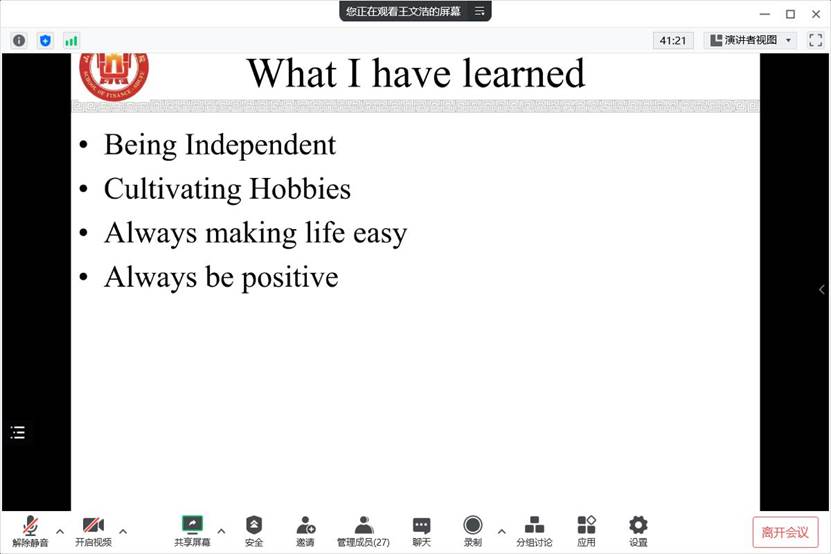 王文浩首先分享了在香港城市大学和美国加州大学圣克鲁兹分校的学习、访学经历;然后就香港和美国申请研究生学位所需条件、奖学金等情况进行了对比,并就学习压力、生活成本等方面进行了介绍。最后,王文浩结合自身学习和科研经历,向同学们分享了出国学习经验,并鼓励同学们以留学作为契机,开阔眼界,丰富人生阅历。