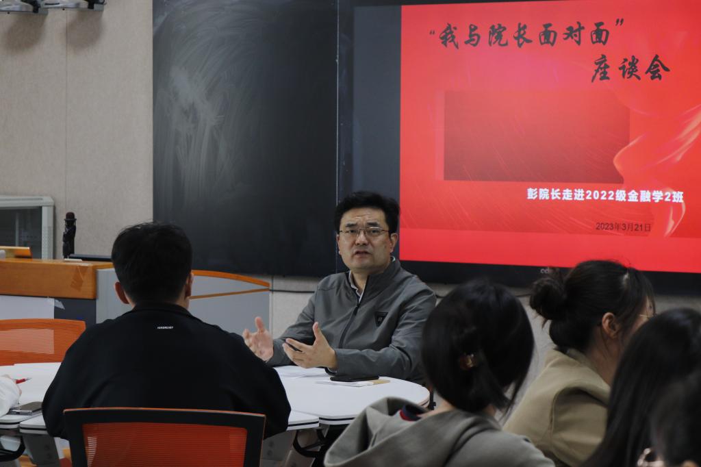 3月21日中午,新澳彩 在圣井校区组织“我和院长面对面”师生座谈会,新澳彩 院长彭红枫走进2022级金融学2班,与同学们进行座谈交流。新澳彩团委书记郭夕煕,2022级辅导员陈玉林以及班级全体同学参加了本次座谈。
