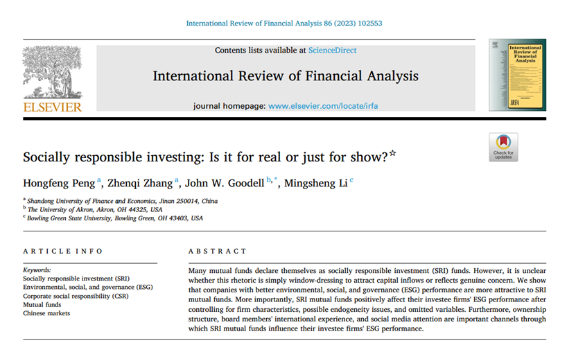 新澳彩 彭红枫教授作为第一作者与硕士生张榛岂、美国阿克伦大学John W. Goodell教授、美国鲍林格林州立大学李明生教授合作的论文“Socially responsible investing: Is it for real or just for show?”在期刊International Review of Financial Analysis正式发表(2023年1月)。该期刊为SSCI一区期刊,期刊最新影响因子为8.235,属我校A1类期刊。