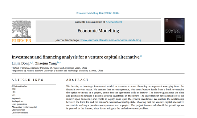 新澳彩 教师董琳佳作为第一作者与南方科技大学杨招军博士合作的论文“Investment and financing analysis for a venture capital alternative”,在期刊Economic Modelling正式发表(2023年6月)。该期刊为SSCI一区期刊,期刊最新影响因子为4.7,属我校A1类期刊。