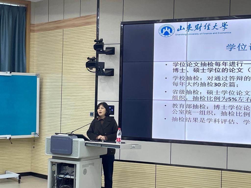 活动于下午14:30开始,历时近两个小时。首先,王丽萍副院长详细解读了与学位申请相关的制度文件,包括学术不端行为检测、论文隐名评阅、论文答辩、论文抽检等方面的规定。透过具体流程与规定的剖析,学生们更深入地了解了整个学术评审过程,为他们学位论文的修订提供了有益的经验。