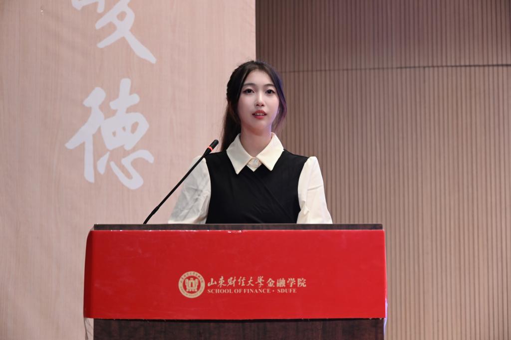 2022级在校生代表杨雅惠从理想信念、专业素养、全面发展、科研实践四个方面分享了她的经验与感悟,并希望同学们能合理安排今后的学习与生活,规划更加清晰的未来,争做顽强拼搏、向上向善的新时代中国青年,在祖国建设的伟大征程中找准自己的青春坐标。