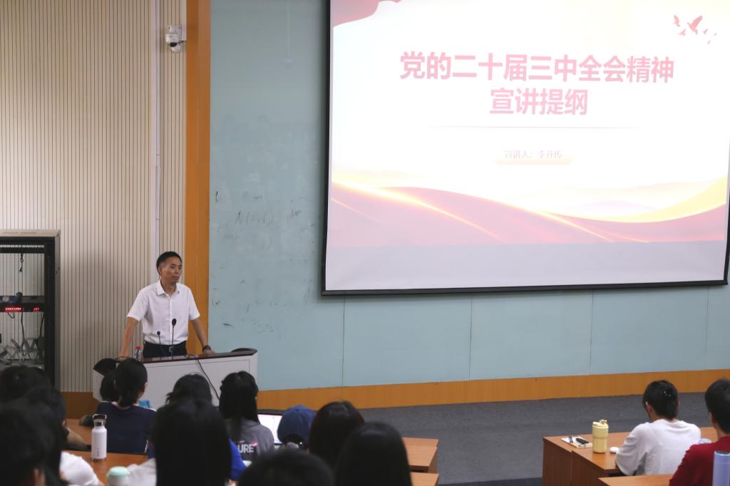 李开传简要介绍了党的二十届三中全会召开的基本情况,带领与会同志深入学习领会习近平总书记在党的二十届三中全会上的重要讲话精神,深刻认识进一步全面深化改革、推进中国式现代化的重大意义和总体要求。李开传从深刻认识全会及其审议通过的《中共中央关于进一步全面深化改革、推进中国式现代化的决定》(以下简称《决定》)的意义,把握《决定》明确的重点领域和主攻方向,贯彻落实全会精神的路径举措等三个方面指出,要全力以赴抓好全会精神的贯彻落实,不断提高自身思想觉悟与政治素养。李开传要求全体研究生以此次党课学习为契机,全面把握全会精神,增强使命感与责任感,以更加饱满的热情投入到学习与科研中去。