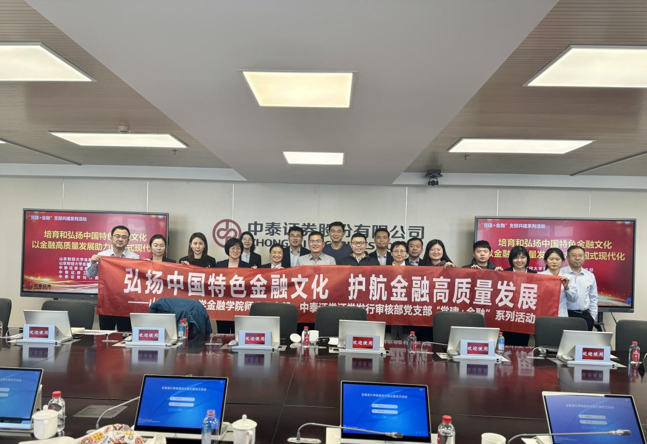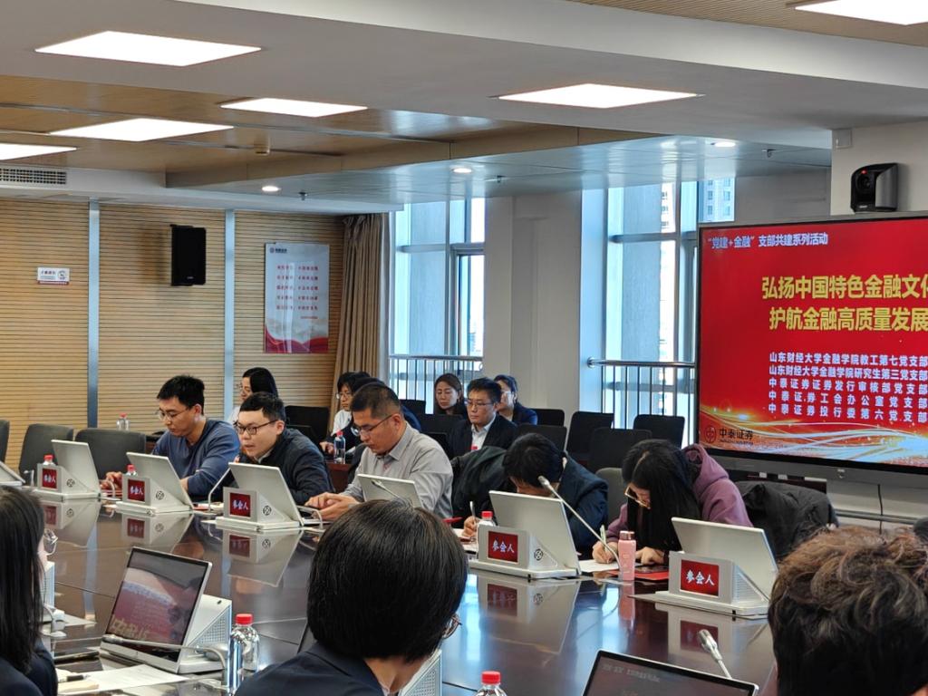 为深入学习宣传贯彻党的二十大精神,进一步坚定理想信念,激发党员队伍的凝聚力,11月28日,由新澳彩 副院长王营带队,新澳彩 教工第七党支部、研究生第三党支部与中泰证券证券发行审核部党支部、中泰证券工会办公室党支部、中泰证券投行委第六党支部联合开展“弘扬中国特色金融文化,护航金融高质量发展”支部共建活动。活动由中泰证券证券发行审核部党支部书记战肖华主持。