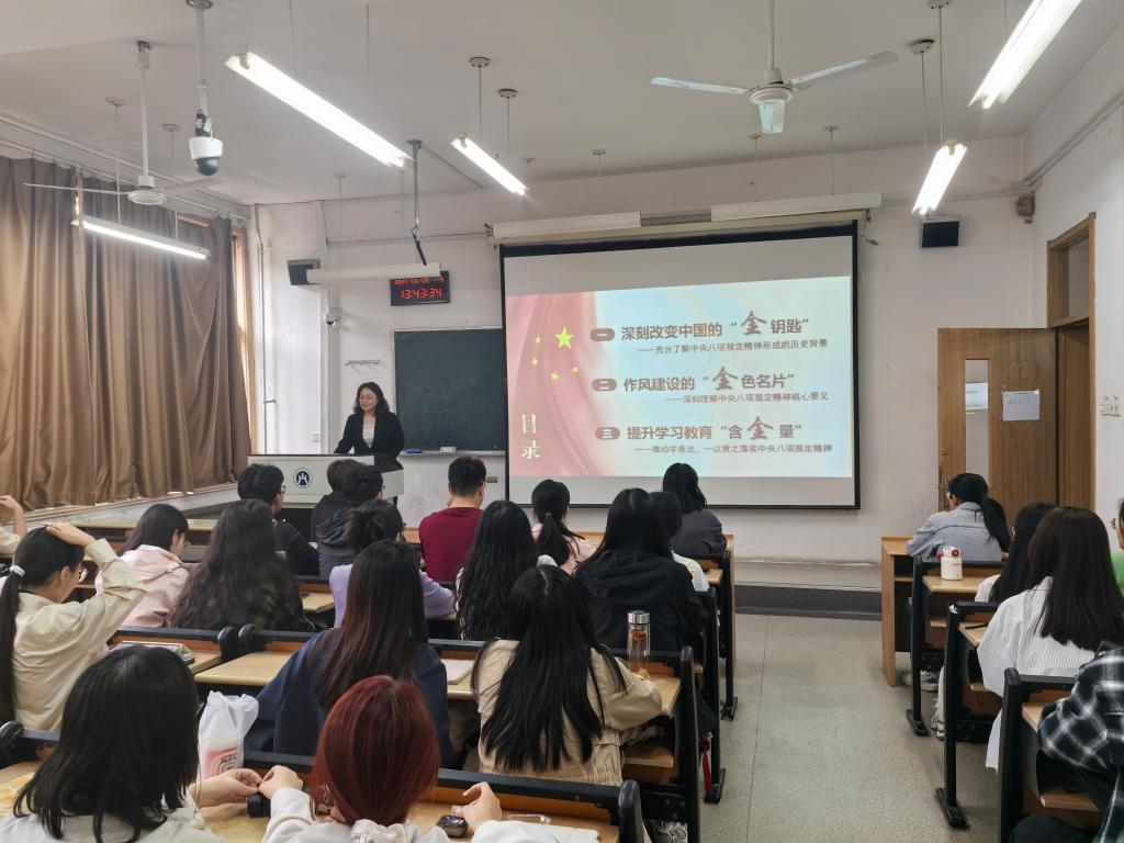 为开展深入贯彻中央八项规定精神学习教育,新澳彩 党委副书记朱翠珍以“中央八项规定让党员‘金色名片’更加明亮”为题为研究生党员和党员发展对象作专题辅导。