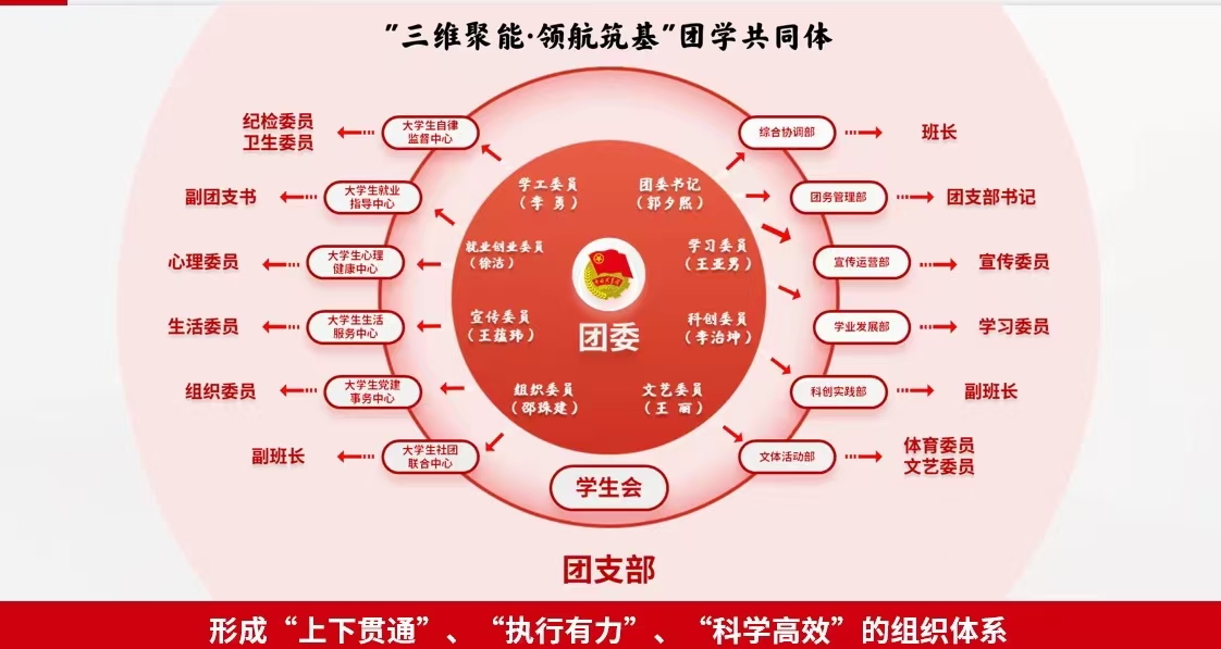构建形成顶层设计-主体力量-基础支撑的“三维聚能、领航筑基”团学共同体,推进班团一体化建设,学生会与团支部联动覆盖率达100%。切实提高团支部工作效率、着重提升组织运行活力,坚持精干高效、各司其职、相辅相成。组织团学骨干赴山东省博物馆、相公庄等地开展“青金致远”红色研学4次,覆盖200人;举办“团心聚力”党团培训5场,以“理论+实践”锻造青年政治骨干,在沉浸式学习中坚定信仰。