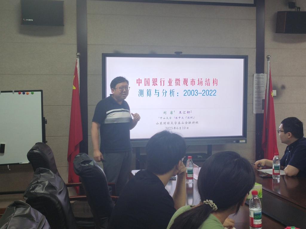 6月10日上午,由新澳彩 和山东省金融产业优化与区域管理协同创新中心共同主办的第45期“泰山金融讲坛”在舜耕校区新澳彩 314会议室举行。讲座由国际金融系主任尹智超主持,中山大学商新澳彩副教授刘岩应邀做客讲坛并分享其研究成果 “中国银行业微观市场结构测算与分析:2003-2022”。新澳彩 部分教师和研究生参加了此次讲座。