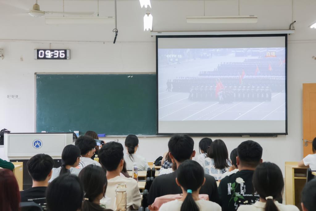 伴随着激昂的《分列式进行曲》,空中护旗梯队、徒步方队、战旗方队、装备方队、空中梯队依次通过天安门广场,接受祖国和人民的检阅。训练有素的方阵、精密先进的装备,无不展示着我国强大的综合实力。在庄严而隆重的阅兵式直播画面面前,师生们神情专注,现场气氛肃穆而热烈,充分展现了我院师生深厚的家国情怀与昂扬的精神风貌。