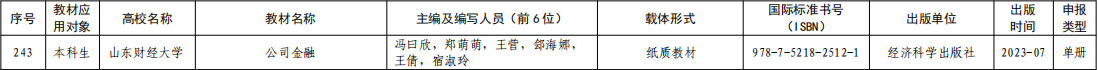 近日,山东省教材委员会办公室正式公布第三批山东省普通高等教育一流教材名单,新澳彩 冯曰欣、郑萌萌老师主编的《公司金融》教材成功入选,标志着新澳彩在金融学科教材建设领域再获省级权威认可。