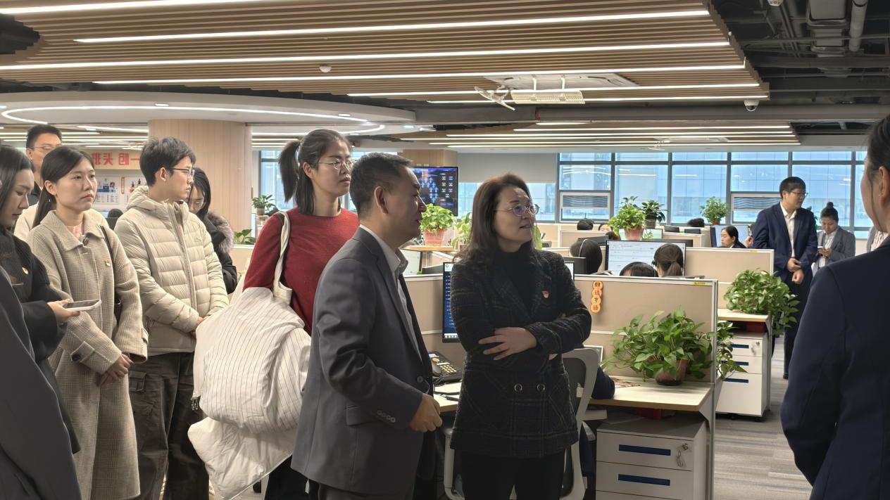 在齐鲁银行远程银行部总经理张功臣的陪同下,师生党员首先参观了部门办公区域,近距离了解数字化运营模式与智能化风控体系,展现了现代金融企业以党建引领业务发展的良好风貌。党员们认真聆听讲解,边看边学,深刻体会到党组织在企业运营中发挥的核心引领作用。
