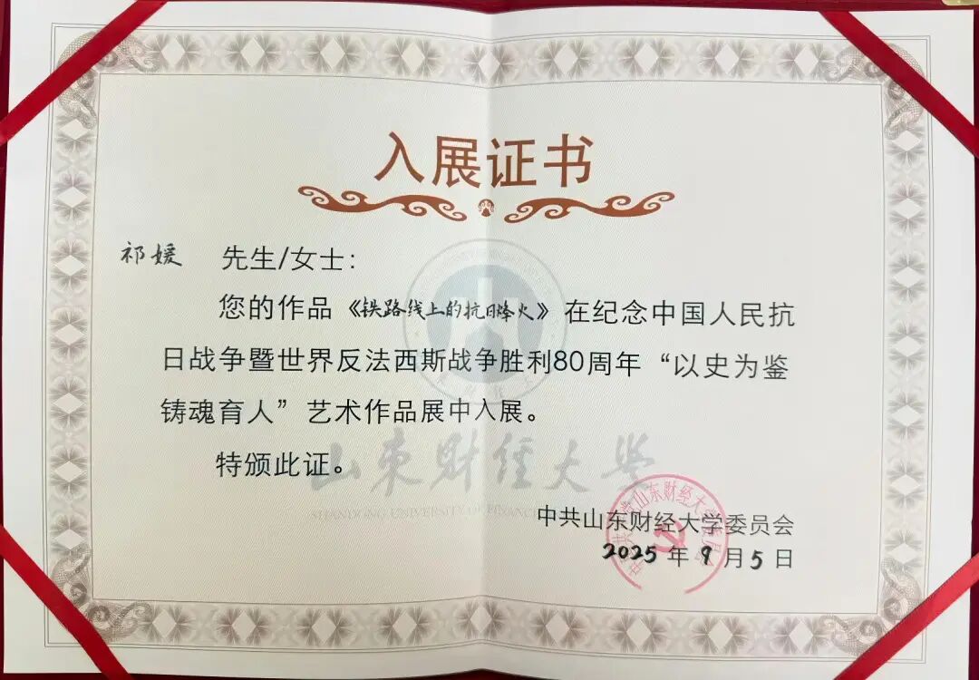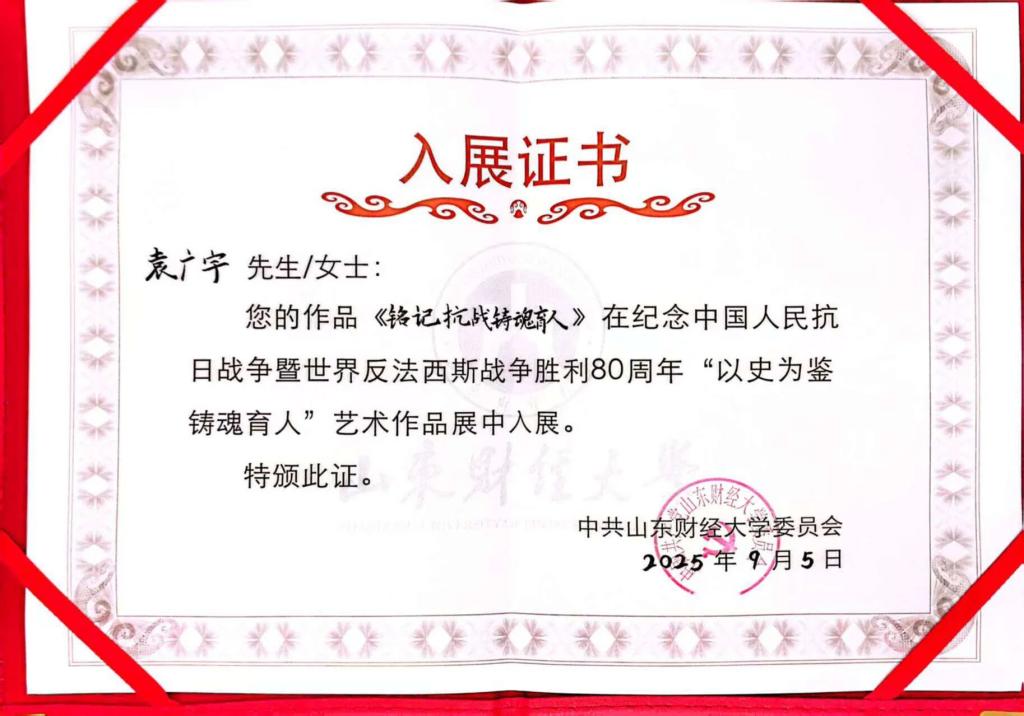 近日,在我校举办的纪念中国人民抗日战争暨世界反法西斯战争胜利80周年“以史为鉴 铸魂育人”艺术作品展中,新澳彩 两名学生的作品成功入展,展现了新时代青年铭记历史、传承精神的责任担当。