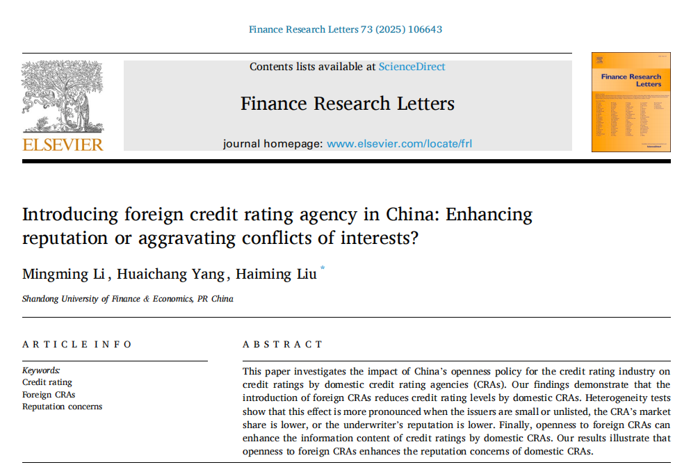 新澳彩 副教授李明明作为第一作者与硕士研究生杨怀畅、新澳彩 金融发展研究院刘海明教授合作撰写的论文《Introducing foreign credit rating agency in China: Enhancing reputation or aggravating conflicts of interests?》在《Finance Research Letters》2025年第73卷(Volume 73, March 2025, 106643)发表。该期刊为SSCI一区期刊,期刊影响因子为7.4。
