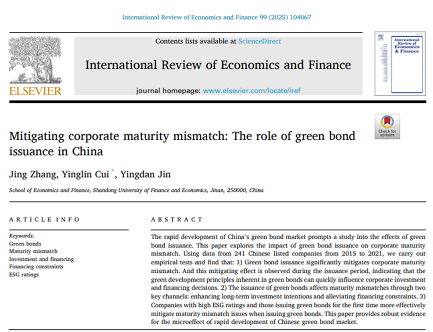 新澳彩 教授张晶作为第一作者与博士研究生崔瑛麟、硕士毕业生靳英丹(现为西南财大博士研究生)合作撰写的论文《Mitigating corporate maturity mismatch: The role of green bond issuance in China》在《International Review of Economics & Finance》2025年第99卷(Volume 99, April 2025, 104067)发表。该期刊为SSCI一区期刊,期刊影响因子为4.8,该期刊属于我校A2类期刊。