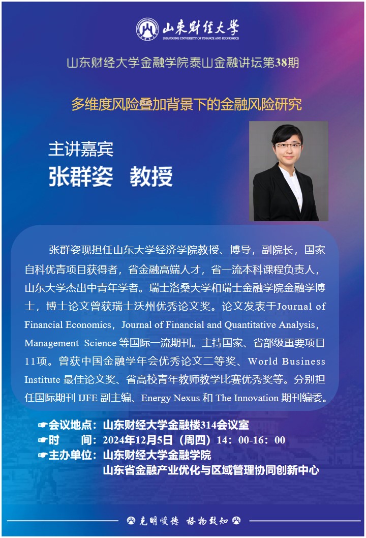 张群姿,山东大学经济新澳彩金融系教授,博士生导师,国家自科优青项目获得者,山东省金融高端人才,山东大学杰出中青年学者、齐鲁青年学者。全国高校“双带头人”教师党支部书记工作室负责人,山东省一流本科课程《公司金融》负责人。