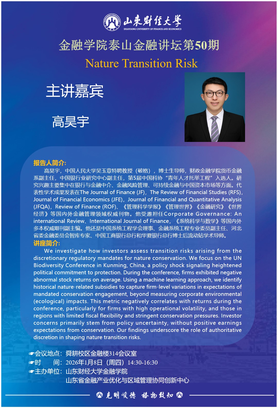 高昊宇,中国人民大学吴玉章特聘教授(破格),博士生导师,财政新澳彩 货币金融系副主任,中国银行业研究中心副主任,第5届中国科协“青年人才托举工程”入选人。研究兴趣主要集中在银行与金融中介、金融风险管理、可持续金融与中国资本市场等方面。代表性学术成果发表在The Journal of Finance (JF),The Review of Financial Studies (RFS)Journal of Financial Economics (JFE), Journal of Financial and Quantitative Analysis(FQA),Review of Finance (ROF)、《管理科学学报》《管理世界》《金融研究》《世界经济》等国内外金融管理领域权威刊物。他受邀担任Corporate Governance:Aninternational Review、International Journal of Finance,《系统科学与数学》等国内外多本权威期刊副主编。他还是中国系统工程学会理事、金融系统工程专业委员副主任、河北省委金融委员会智库专家、中国工商银行总行和华夏银行总行博士后流动站学术导师。